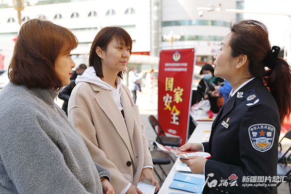 4月13日,在乌鲁木齐市沙依巴克区友好商场前,沙依巴克区司法局友好南路司法所所长郭雪雁正在为前来咨询的群众讲解《国家安全法》及《物权法》的相关内容。记者 秦鹏 摄