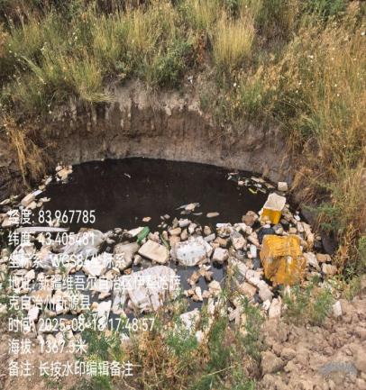 图3、4 2025年8月18日,督察组现场督察发现,新源县那拉提镇生活垃圾填埋场渗滤液外溢形成2个约50平方米的渗坑。